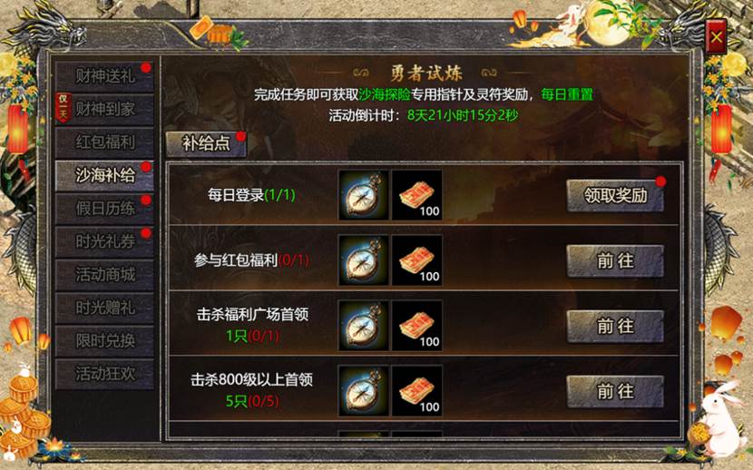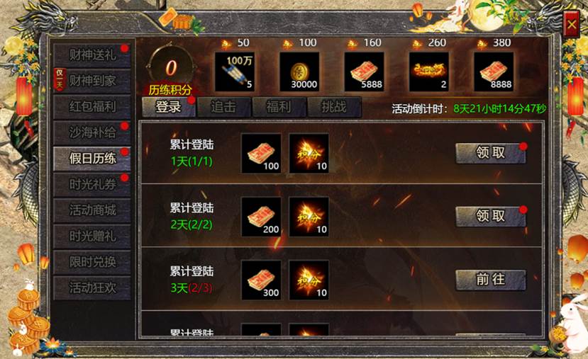 活动期间完成任务可获得历练积分,累积获得积分达指定数量可领取历练奖励,完成任务亦可获得灵符奖励。(登录任务7天,活动共7天)