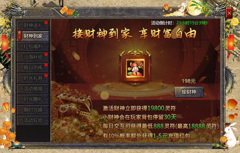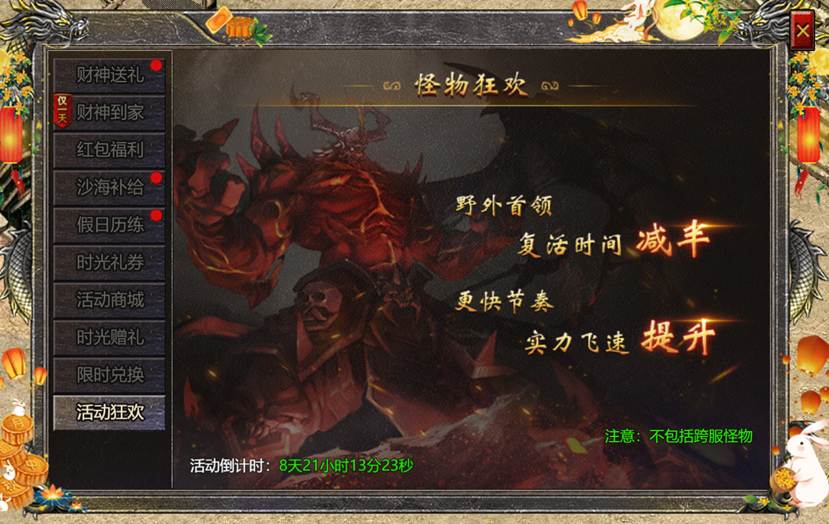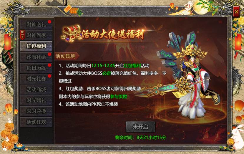 活动期间每天中午12:15-45开启活动副本,击杀boss可获得充值红包,共7天